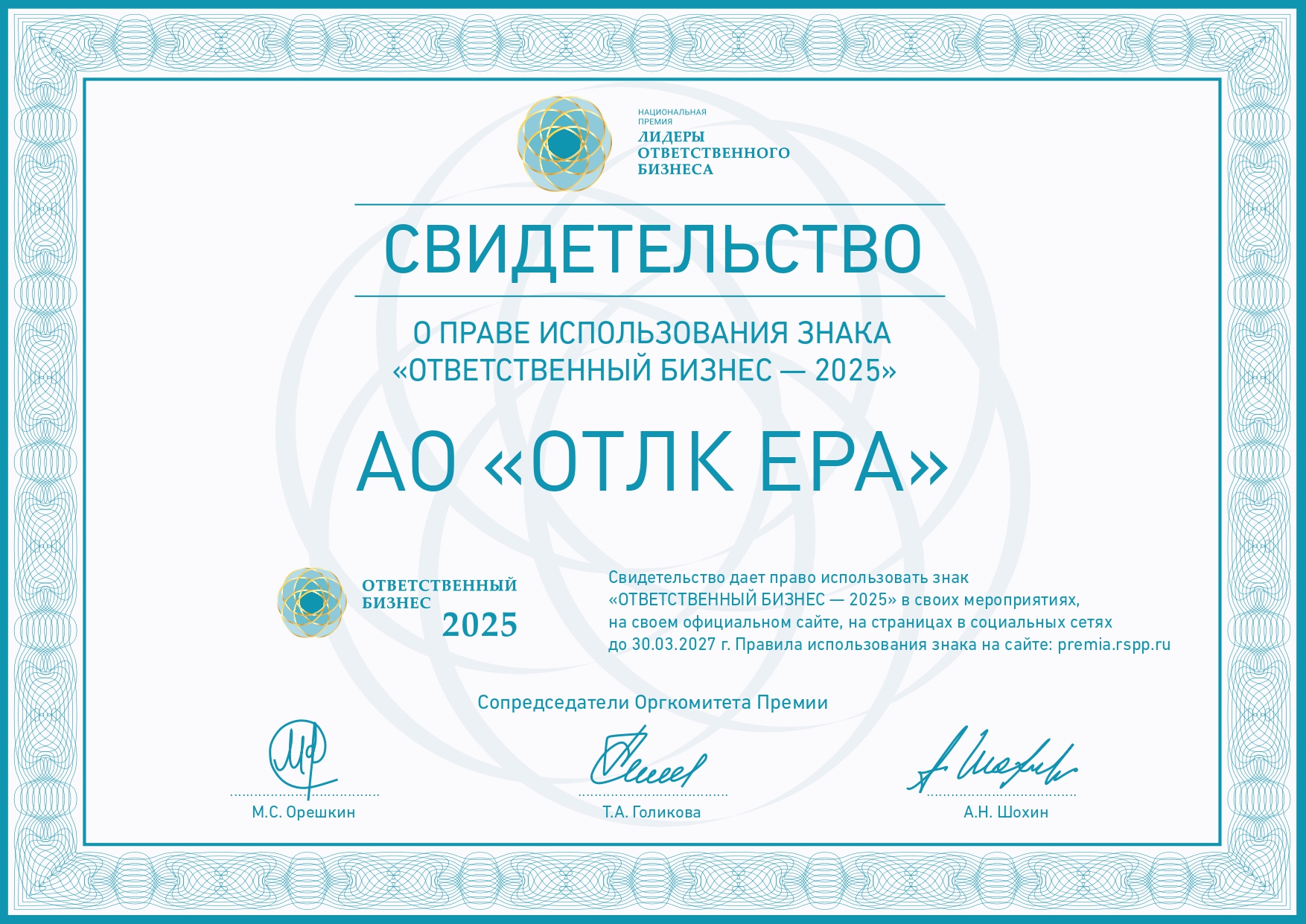 АО «ОТЛК ЕРА» стало лауреатом Национальной премии «Лидеры ответственного бизнеса – 2025» и удостоено свидетельства, подтверждающего право использования знака «Ответственный бизнес».
